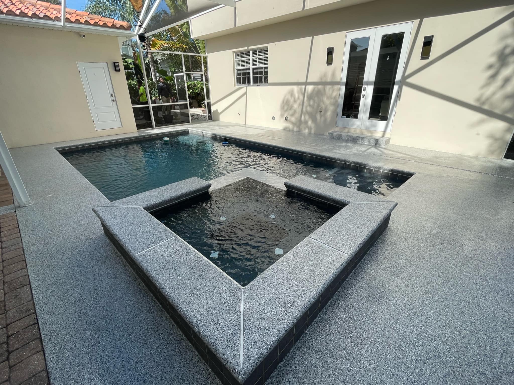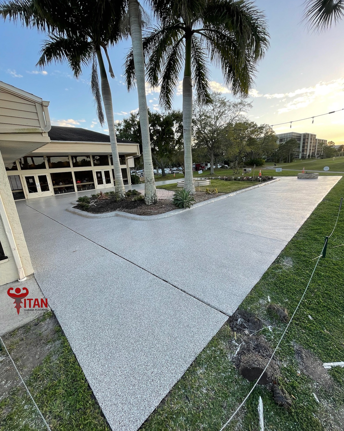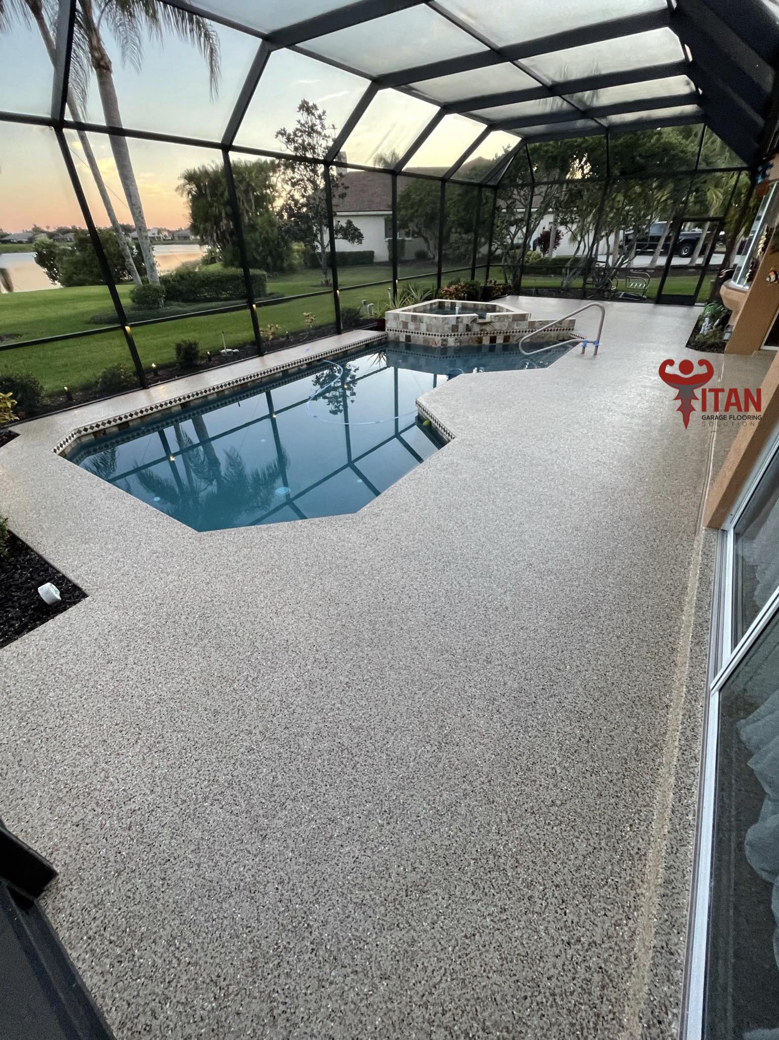 Our outdoor living concrete-coated flooring is more durable than other coatings; a Titan solution doesn’t chip, crack, or peel, or have a long cure time. They resist sun and color degradation far better than any other flooring solution on the market. Beyond that, you can literally walk on your outdoor living floors in 6 hours and park a car or put back furnishings in 24 hours. In addition, we provide a wide range of flooring finishes, including full broadcast selections that can make surfaces look like natural stones, and over 150 colors to choose from.