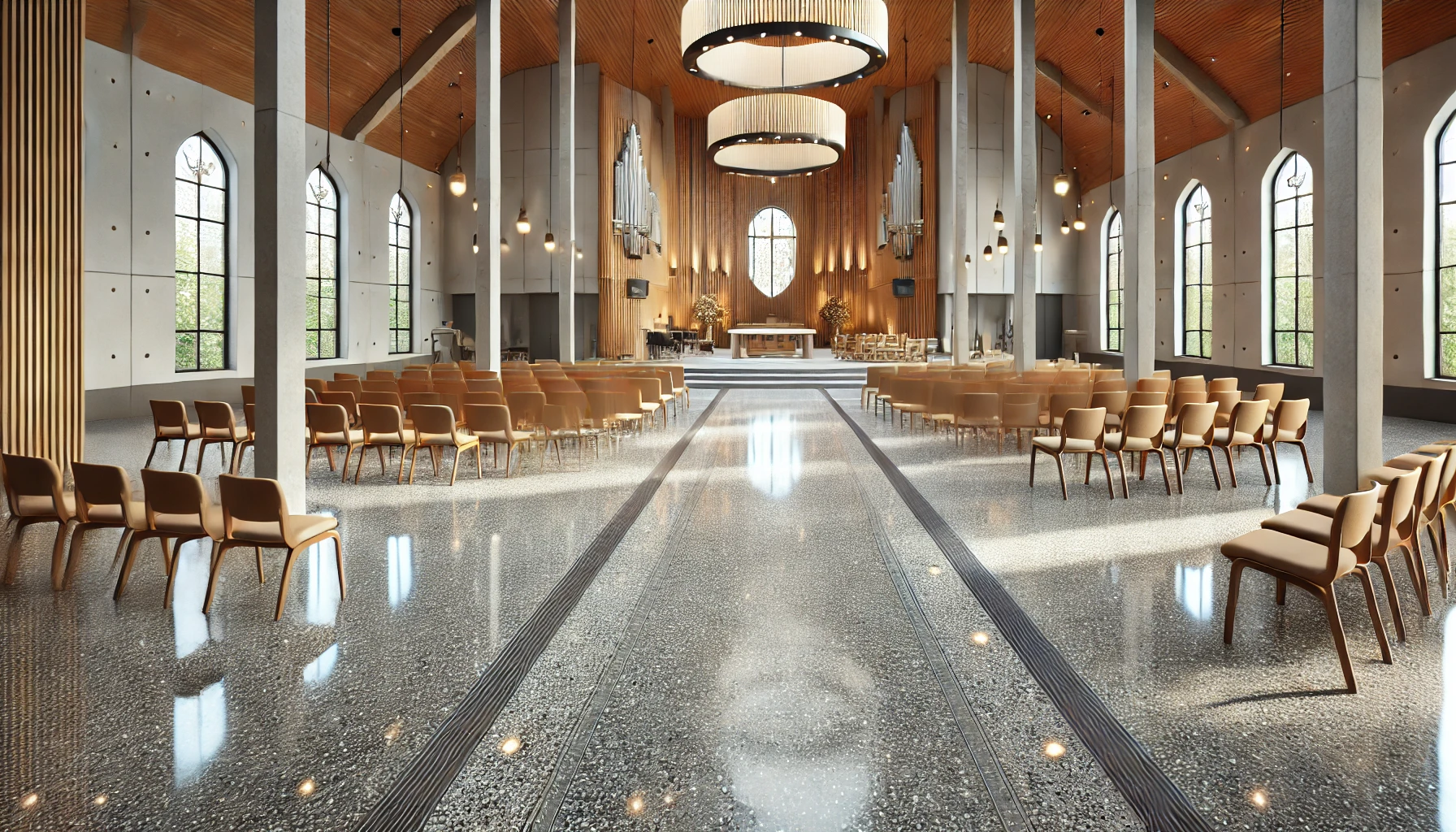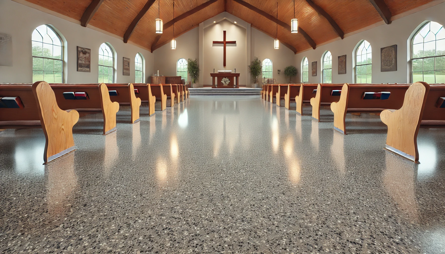 Titan’s polyaspartic and polyurea basecoats outperform traditional epoxy coatings with faster cure times, superior durability, and resistance to abrasions, impacts, chemicals, and UV rays. Their flexibility and excellent adhesion withstand temperature fluctuations and substrate movements without cracking. Ideal for workshop spaces, they offer superior moisture resistance and versatility in various temperatures. The seamless, non-porous surface is easy to clean and maintain, providing a high-performance, long-lasting flooring solution perfect for worship spaces.